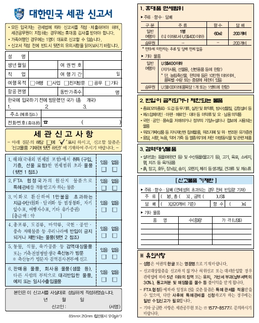 내국인이 입국시 면세한도 600달러를 초과해서 반입하는 경우 초과분에 대한 세금을 신고하고 납부해야 하지만 여행객들에게 세관신고서는 여전히 형식적인 종이조각에 불과하다. 세관의 여행객 검사비율이 1%수준에 그치기 때문에 '설마 내가 걸릴까' 하는 마음과 함께, 혹시 운이 나빠 걸리더라도 '그때 세금내면 되지 뭐'하는 대담함이 겹치면서 제대로 작성된 신고서를 찾기는 쉽지 않다.