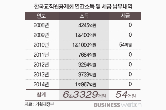 25일 기획재정부에 따르면 한국교직원공제회가 2008년부터 2014년까지 벌어들인 소득은 총 6조3329억원이었다. 이 가운데 2008년과 2009년, 2011년부터 2014년까지 세금 납부액은 '제로(0)'였다. 세금을 낸 해는 2010년(54억원) 딱 한 번이었다.