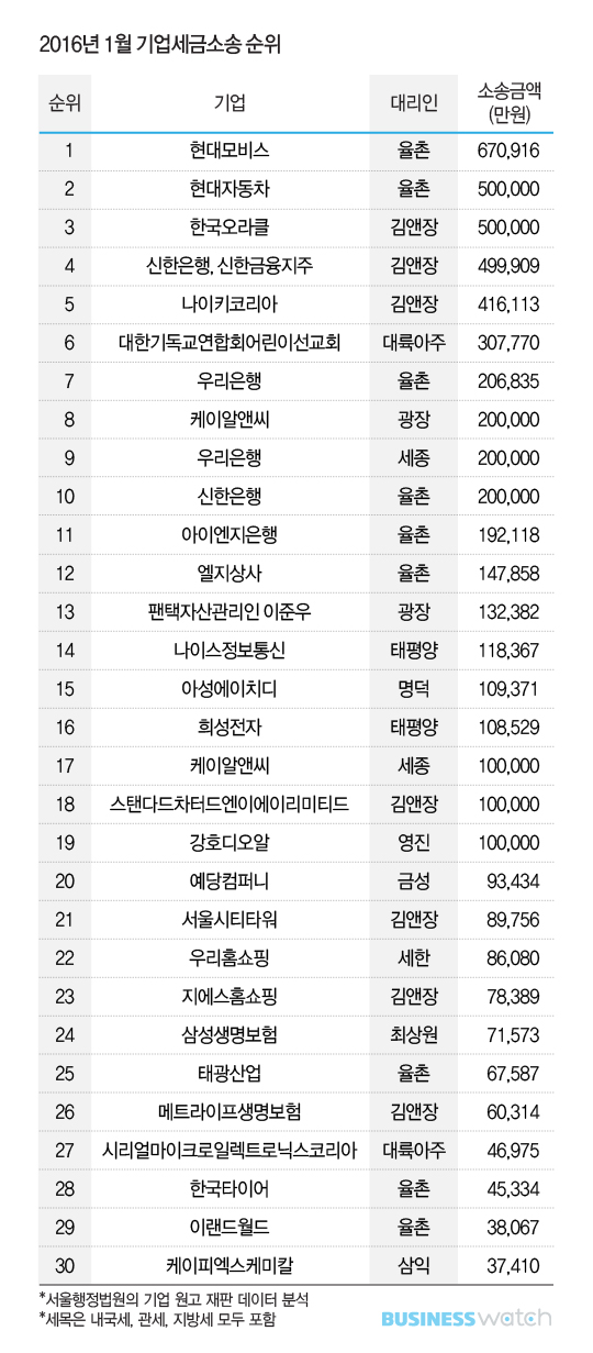1월 한 달간 서울행정법원에서 기업이 진행한 조세소송 중 소송물가액(소가)이 가장 큰 사건은 현대모비스의 법인세 부과처분 취소소송으로 나타났다. 현대모비스는 소가 57억원짜리 법인세 소송과 소가 10억원의 법인세 소송 등 총 67억원이 걸린 재판을 하고 있다. 1월 중 재판이 열린 기업 조세소송 50건 중 소가 순위 1위다.