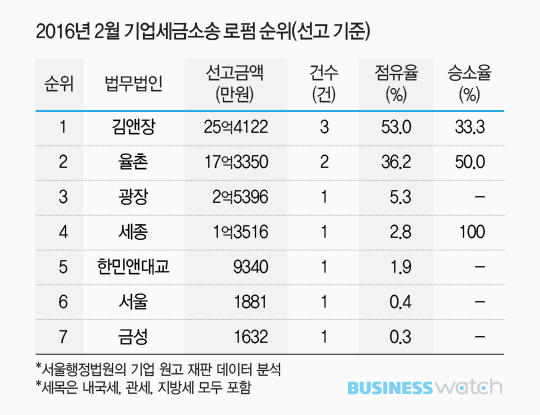 법무법인 광장은 삼성전기의 관세 소송을 진행하면서 점유율 3위에 올랐고, 메리츠화재해상보험의 취득세 소송을 승리로 이끈 법무법인 세종이 점유율 4위를 차지했다. 이어 법무법인 한민앤대교, 법무법인 서울, 법무법인 금성 등이 기업 세금소송 부문 '톱7'에 이름을 올렸다.