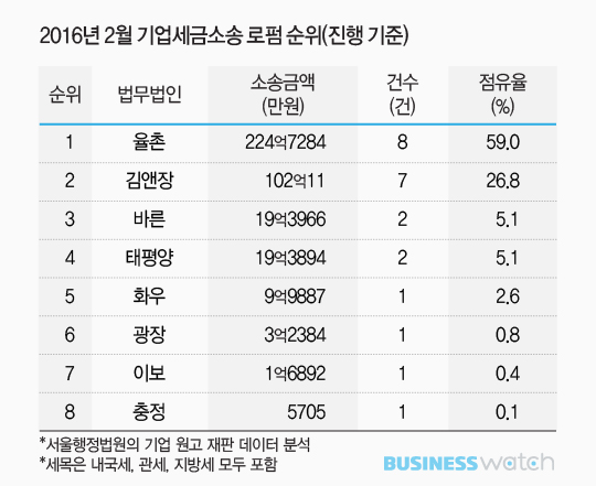 현재 진행 중인 사건에서는 율촌이 김앤장을 앞질렀다. 율촌은 2월에 진행된 기업세금 재판 8건을 담당했고, 소송 총액은 224억원에 달했다. 효성을 비롯해 한국타이어월드와이드, 한국수출입은행, 신한은행, 현대글로비스, 대상 등이 율촌의 고객이다.