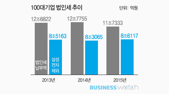 하지만 전년에 비해서는 법인세 납부액이 1조3000억원 감소했다. 1년 사이 줄어든 세금이 현대자동차의 한 해 납부액보다 많다. 100대 기업의 총 법인세 납부액이 줄어든 것도 이 때문이다. 삼성전자를 제외할 경우 100대 기업의 총 법인세 납부액은 오히려 전년보다 3000억원 늘어난다.