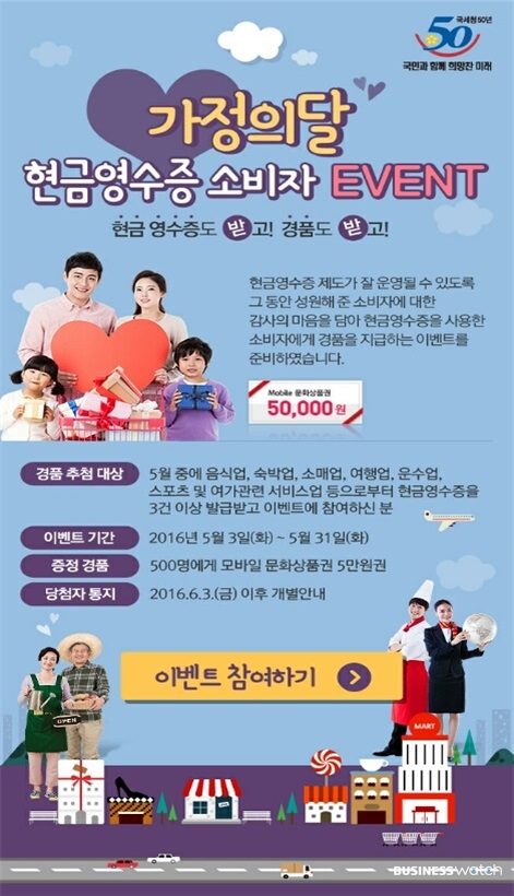 국세청은 5월 가정의 달을 맞아 현금영수증을 받은 소비자 500명에게 모바일 상품권 5만원을 증정한다고 3일 밝혔다.