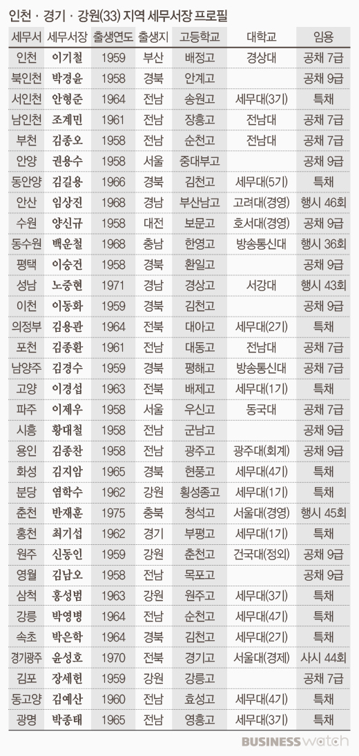 경기와 강원지역도 사정은 비슷합니다. 경기도 22개 세무서장 가운데 경기도에서 태어난 사람은 한 명도 없고, 인천의 4개 세무서장도 모두 '비(非)인천' 출신입니다. 강원지역은 세무서장 7명 가운데 5명(71%)이 타지역에서 건너왔습니다.