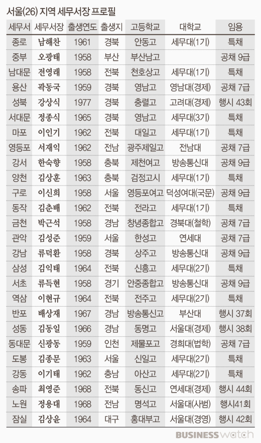 전국에서 세금을 가장 많이 걷는 서울에서 세무서장을 한다는 건 국세청 공무원들의 로망입니다. 대기업과 유명 인사, 자산가들의 세금을 속속 들여다보는 만큼, 막강한 영향력을 갖고 있는데요. 그들의 출신지는 어디일까요.