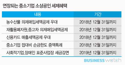 올해말에 끝나는 재활용폐자원, 중고자동차 의제매입세액공제도 2018년 말까지로 연장되며 자영업자의 신용카드 매출세액공제 확대적용 혜택도 2018년 말까지로 2년 더 연장된다.