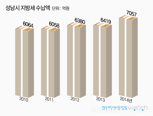 18일 행정자치부와 성남시에 따르면 성남시의 지방세 수납액은 2011년 6058억원, 2012년 6380억원, 2013년 6419억원, 2014년 7057억원으로 2011년 이후 급증했다. 4년만에 1000억원이 불어났고, 2013년과 2014년 사이에만 600억원 이상 증가했다. 성남시의회에서 결산작업이 진행중인 2015년의 수납액은 증가폭이 더 클 것으로 예상된다.