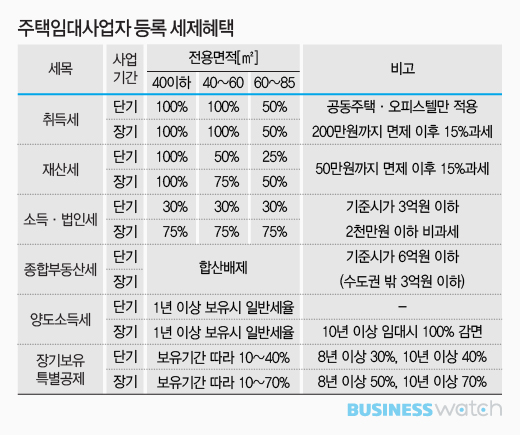 기본적으로 주택임대사업자등록을 하면 취득세(공동주택·오피스텔만)의 경우 전용면적 60㎡ 이하에 대해서는 단기와 장기임대 모두 100% 면제해 줍니다. 재산세는 40㎡ 이하인 경우에만 100% 면제하고, 40~60㎡인 경우 단기는 50%, 장기는 75% 면제됩니다. 또 60~85㎡ 임대주택은 단기임대는 재산세의 25%, 장기임대는 50%가 면제됩니다. 이밖에 소득세와 법인세는 40~85㎡인 경우 단기임대는 30%, 장기임대는 75% 면제 혜택을 줍니다.