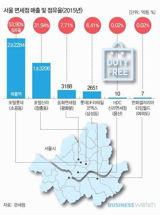 서울 면세점 중에는 지난해 전국 매출 1위를 차지한 소공동 롯데면세점본점이 단연 돋보인다. 연매출 2조2284억원으로 서울지역 면세점 가운데 53.9%의 높은 점유율을 나타냈다. 2위인 장충동 신라면세점본점(1조3206억원, 31.9%)을 압도한다.