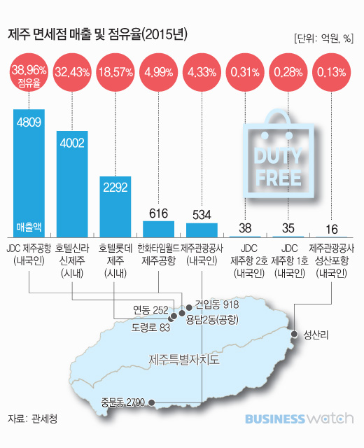 현재 전국 곳곳에서 영업중인 면세점은 50곳이다. 서울 시내에만 10곳이 몰려 있고 인천공항에 7곳, 제주에는 9곳의 면세점이 있다. 지역별로 매출 규모가 크고 점유율이 높은 면세점은 어디일까.