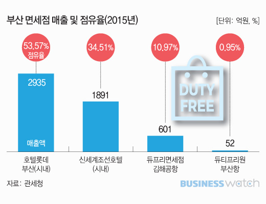 부산도 호텔롯데시내면세점이 2935억원(53.6%)으로 1위를 지켰다. 신세계조선호텔면세점은 1891억원(34.5%)으로 2위에 올랐고 듀프리면세점 김해공항이 601억원(11.0%)으로 뒤를 이었다. 부산항에서 영업중인 듀티프리원면세점은 매출 52억원을 올렸다.