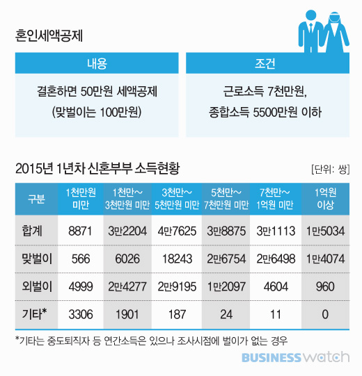 2015년 기준 맞벌이로 5000만원 넘는 소득을 올리는 신혼부부는 6만7326쌍이고, 소득이 7000만원 넘는 맞벌이 신혼부부는 4만572쌍이다. 소득이 많은 이들도 인적공제나 신용카드소득공제 등 다른 소득공제를 하나도 받지 못한다고 가정해야만 100만원의 혼인세액공제를 전액받을 수 있다.