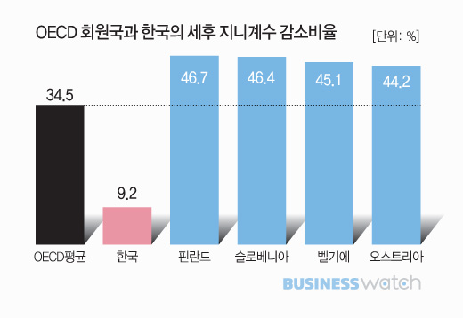경제협력개발기구(OECD)의 2015 Revenue Statistics 자료를 보면 OECD 30개국(자료가 없는 캐나다·칠레·일본·영국 제외)의 평균 세전세후 지니계수(소득분배 불평등 지표) 감소비율은 34.5%에 달하지만 우리나라는 9.2%로 OECD평균의 4분의 1에 불과했습니다.
