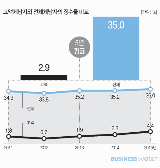국세청 소관인 국세체납액은 지난해 기준 13조원에 달하는데 체납액의 징수율은 최근 5년 평균 35%에 불과합니다. 65%의 체납세금은 걷히지 않고 있죠. 수억원에서 수십억원의 고액의 세금을 상습적으로 체납하는 경우 징수율은 더 떨어지는데요. 고액체납자(국세 고액체납자명단 공개 기준 : 2011년 7억원, 2012~2015년 5억원, 2016년 3억원 이상)의 2011년 이후 5년 간 평균 징수율은 2.9%로 3%도 되지 않습니다.
