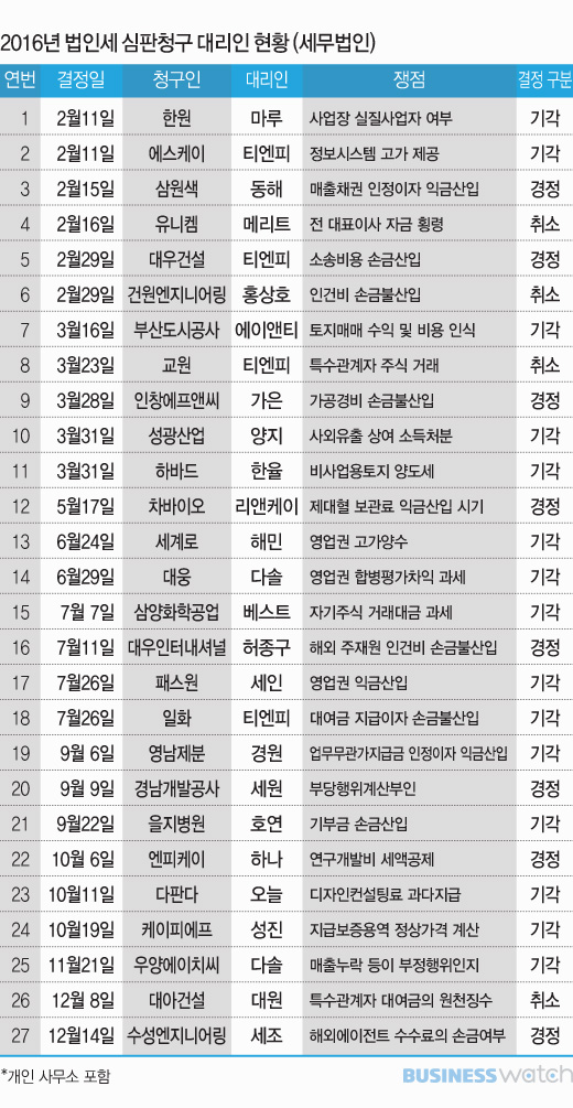 심판 청구에서 대리인이 중요한 이유다. 특히 전직 세무관료 출신이 대리인으로 나설 경우 성공 확률이 높아진다는 평가다.