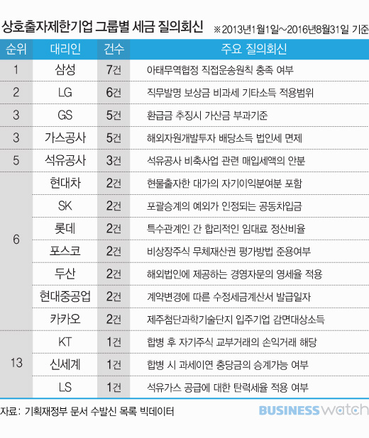 대기업 계열사들은 총 43건을 질의했는데 삼성그룹이 7건으로 가장 많았다. LG그룹이 6건, GS그룹이 5건으로 뒤를 이었고 현대차그룹과 현대중공업그룹, 카카오가 각각 2건의 질의회신을 기재부와 주고 받았다.