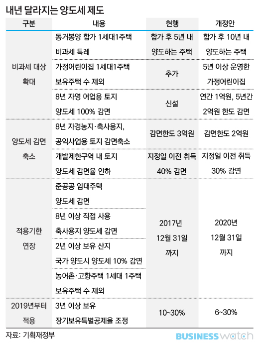 1세대1주택 비과세 대상은 올해보다 일부 확대하지만 자경농지와 축사용지, 공익사업용 토지, 개발제한구역 토지 등에 대한 양도세 감면 혜택은 줄어듭니다. 당초 올해까지만 적용할 예정이었던 양도세 감면제도들은 대부분 2020년까지 연장했습니다. 내년부터 달라질 양도세 분야 주요 제도를 살펴보겠습니다.