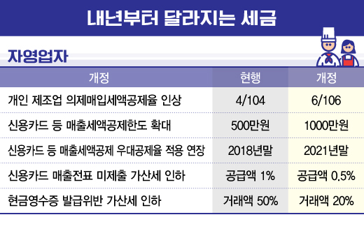 자영업자들에 대한 세금부담은 줄어든다. 우선 신용카드 등 매출세액공제 한도가 종전 500만원에서 1000만원으로 늘었다. 업종별로 기본공제율에 0.3%p~0.6%p를 더한 우대공제율(1.3%~2.6%) 적용기간도 2021년말로 연장됐다. 음식점이나 숙박업종 간이과세자의 경우 고객이 신용카드 등으로 결제한 금액의 2.6%(최대 1000만원까지)를 내야할 부가가치세(매출세액)에서 공제할 수 있다.