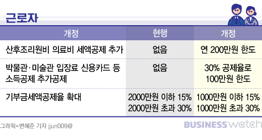기부금 세액공제도 늘어난다. 현행 30% 이상 세액공제되는 고액기부의 기준이 '2000만원 초과'에서 '1000만원 초과'로 낮아져서 2000만원을 기부한 경우 종전에는 2000만원의 15%인 300만원만 세액공제 받았지만 내년에는 1000만원의 15%(150만원)와 1000만원 초과분의 30%(300만원)의 합계인 450만원을 세액공제받는다.