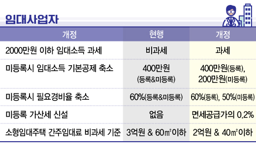 우선 미등록 임대사업자는 현행 60%인 임대소득에 대한 필요경비율이 50%만 적용된다. 또 임대소득에 대한 기본공제액도 현행 400만원의 절반인 200만원으로 줄어든다.