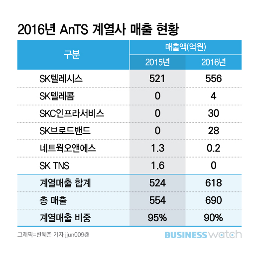 AnTS는 경기 안양에 위치한 통신장비 제조업체로 2016년 매출액 690억원 가운데 SK 계열사와의 내부거래가 무려 618억원에 달했다. 계열사 매출 비중 90%로 일감몰아주기 과세대상 요건(30%)을 훌쩍 넘어선 수치다. 일감을 대준 계열은 SK텔레시스(556억원), SKC인프라서비스(30억원), SK브로드밴드(28억원), SK텔레콤(4억원), 네오웍오앤에스(2328만원) 등 5곳이다.