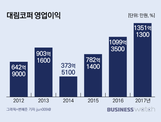 비결이야 뭐, 두말하면 잔소리다. 2017년 매출에서 내부거래가 1조원이 넘는 31.72%(1조140억원·여천NCC, 폴리미래 등 관계회사 포함)다. 주력사 대림산업 14.72%(4710억원), 대림과 한화의 합작(50대 50) 석유화학업체 여천NCC 10.24%(3270억원) 등 계열사들의 지원이 큰 몫을 하고 있다.