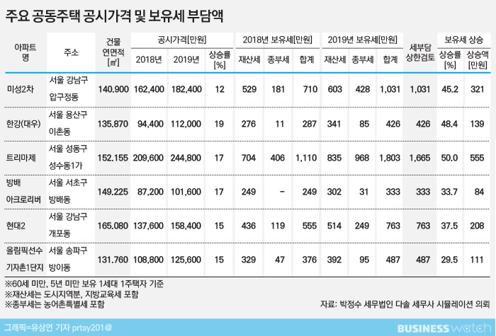 방이동 올림픽선수기자촌1단지(131㎡)와 방배동 방배아크로리버(149㎡)는 각각 111만원(29.5%)과 84만원(33.7%)씩 보유세를 더 내는 것으로 조사됐다.
